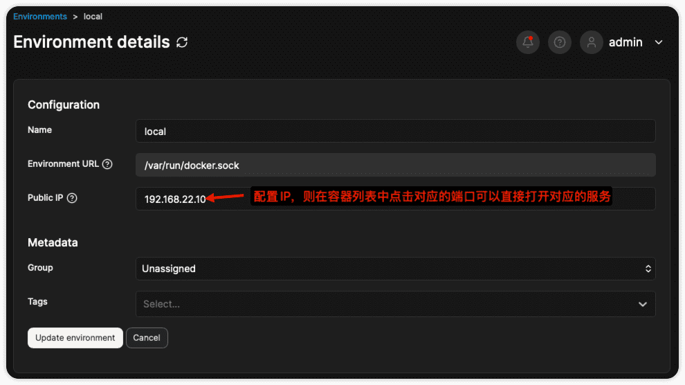 Environments-related->Environments菜单可以看到所有环境,可以在此添加、删除和修改环境。比如这里修改local环境的Public IP