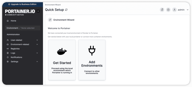 Get Started会自动监测到本地docker环境,并自动创建名称为Local的环境。 -