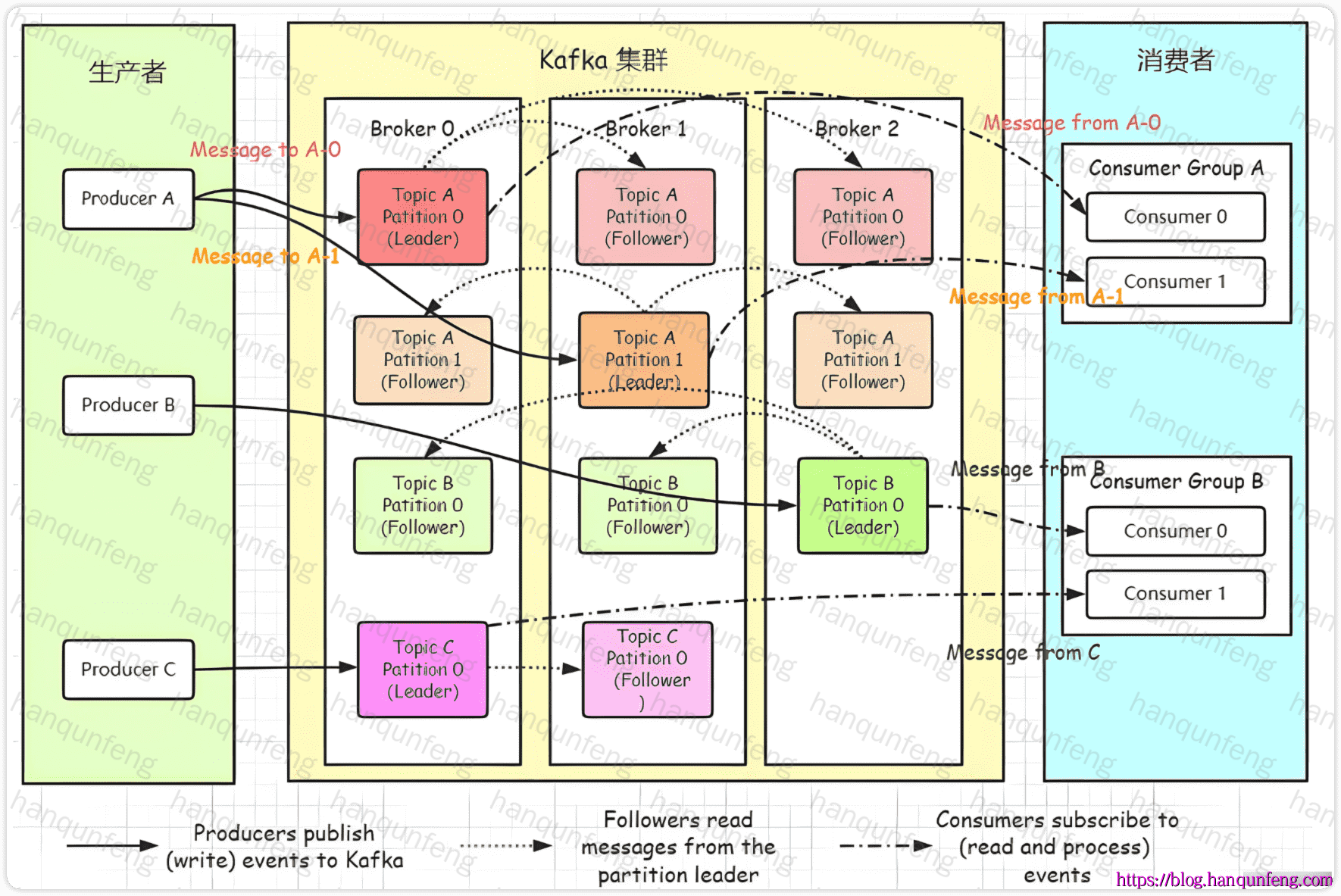 Broker(节点 / 服务器) | Kafka 集群中的服务器实例,负责接收、存储、分发消息 |
